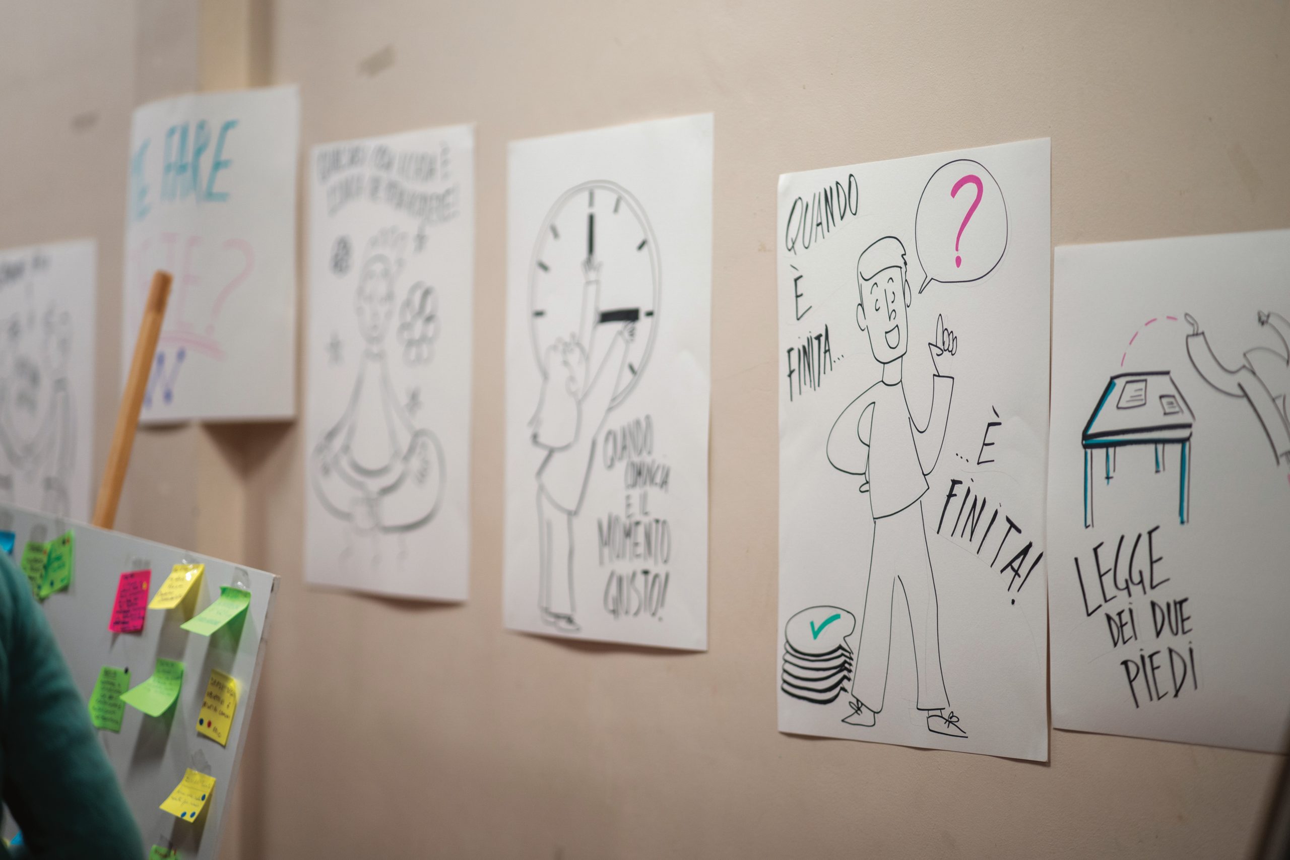 Entriamo in tema. Viene posta la domanda: Come si fa rete? Ognuno scrive su uno o più post-it, gli argomenti che potrebbero aiutarci ad arrivare ad una soluzione concreta; questi pezzettini di carta pieni di idee, vengono attaccati dai pensatori stessi su una lavagna. Si vota, così si dice, anche se alla fine del voto non ci sono vincitori e vinti. Serve semplicemente a raggruppare le idee o i temi in modo da creare gruppi di interesse comune. Il tempo è limitato, si cercano di evitare voli pindarici e fuori-tema perché, altra regola del Forum aperto, è che la nostra libertà di parola è limitata da quella degli altri. Nel frattempo la facilitatrice visuale, Stefania Chieffi (giovane grafica di Focus in, Italia in Rete etc. etc.) traduce in immagini le discussioni in corso. Continuerà questo suo lavoro di traduzione all’interno dei gruppi. La restituzione agli altri gruppi è accompagnata dalla traduzione in immagini, tutto molto schematico, perché l’idea è arrivare all’essenziale.