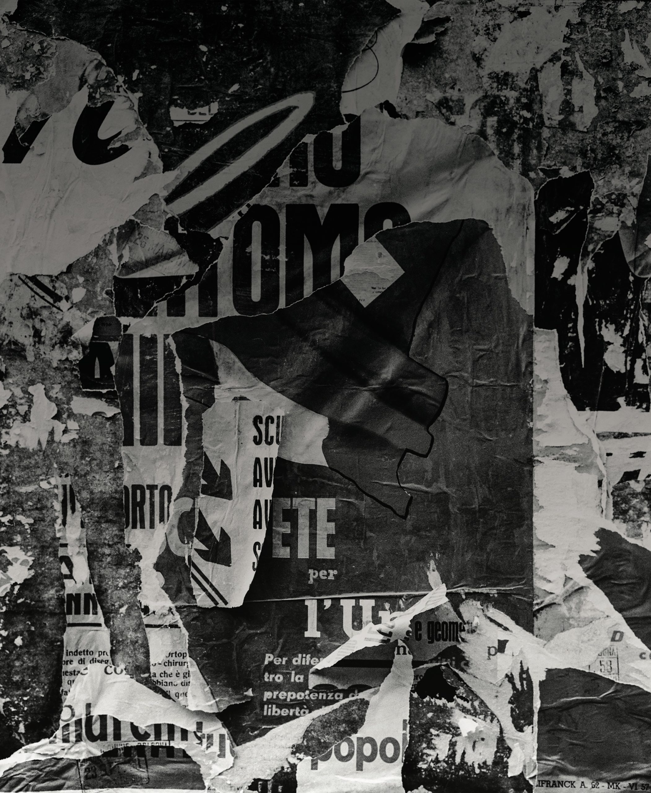 Il che avviene secondo un dispositivo di rovesciamento dello sguardo, inversione delle lettere, come nell’invenzione voluta dal maestro nella fondazione del movimento Abrecal – Gruppo Ricerca Percezione Globale (1982-1991), nome speculare rispetto a quello di Lacerba, la rivista di Giovanni Papini e Ardengo Soffici, proprio per affermarne l’affiliazione futurista. Del resto la pittura è e rimane un orizzonte costante nell’esplorazione attraverso sperimentazioni, supporti, tecniche di piani narrativi diversi ma da cui emerge sempre una soggettività irrinunciabile cui un mezzo come la fotografia, prigioniera dell’obiettivo, raramente sembra affidarsi. Di tale confronto con la pittura è esempio il fatto che le foto del nostro dossier su Bologna, dei muri bolognesi abitati da scritte e manifesti strappati Nino Migliori le avesse già immaginate ed esposte nel 1954, ovvero un anno prima che Mimmo Rotella esplorasse il tema con i suoi “décollages”. Tale affinità con la pittura non si limita al piano estetico ma si esprime anche su quello politico, soprattutto quando si vuole che la ricerca sia un progetto aperto a tutti, condiviso attraverso l’idea di comunità o gruppi com’era stato per le avanguardie. L’infinitamente piccolo, o il più quotidiano degli oggetti, sono storie che devono essere raccontate proprio per il loro essere traccia di un’umanità che dalle sue origini, dai graffiti sulle pareti delle caverne, non smetterà mai di trasmettersi.